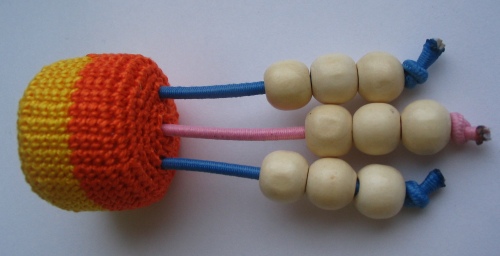 Также нашила в серединке такие веревочки, на них нанизала деревянные бусинки, можно их погрызть :). Бусинки точно не слетят.