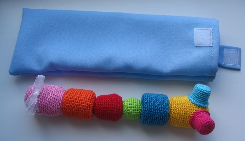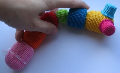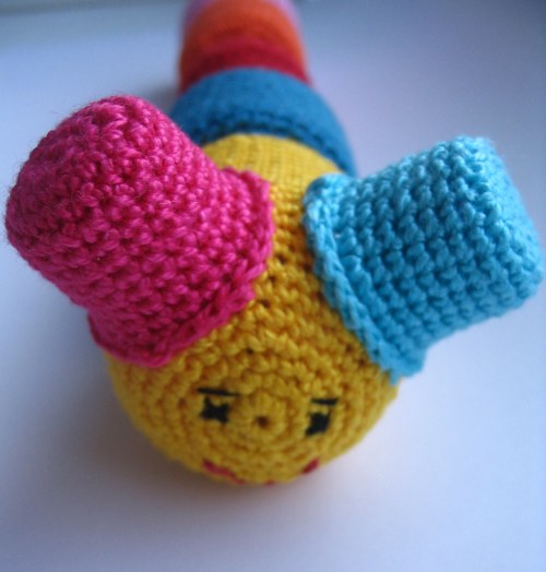 Эту гусеницу связала прям перед самыми родами из разных остаточков. Она гремит. Рожки - это две крышечки от пакетов майонезных.
