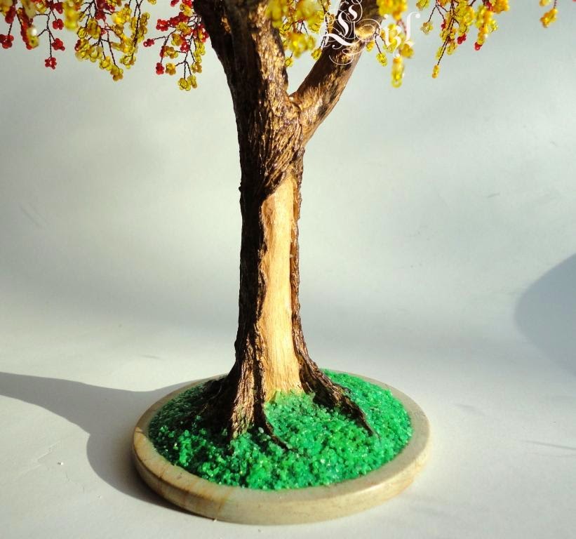 Для того, чтобы сделать деревце из бисера, необходимо сплести веточки, прикрепить их на каркас толстой проволоки, посадить в поддон, горшочек или просто залить гипсом в любую невысокую форму. Потом утолщить ствол смесью гипса, клея ПВА и воды. Смесь должна быть густой, как домашняя сметана.