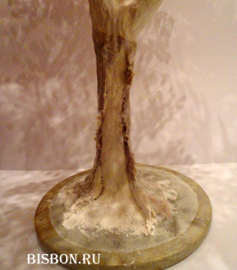 Намазываем кисточкой ствол дерева и приклеиваем порванную бумагу, чтобы можно было обернуть ствол и оставить разрез на коре. Если будут образовываться складочки, поправляйте их, чтобы они были вертикальными. Так у нас будет формироваться кора. Как только всё расправили, аккуратно промажьте всё клеем ПВА.
