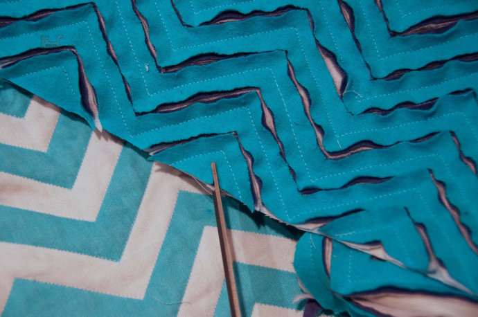 Шить на расстоянии 1-2 см по косой, чтобы потом не лезли нитки.