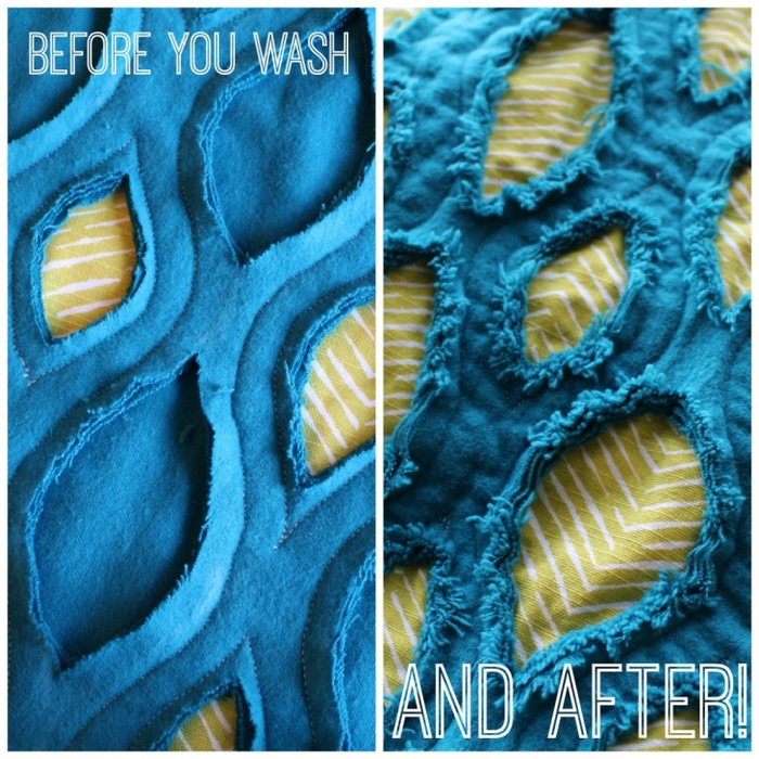 При расположении слоев ткани последовательно от самого светлого к самому насыщенному после влажной обработки (стирки) получается глубокий объемный эффект.