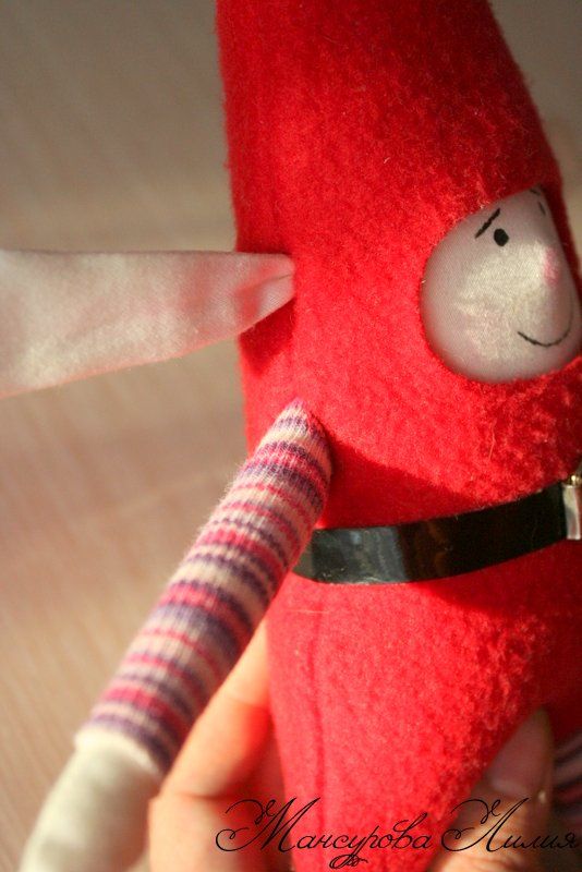 Я использовала красный флис.Раскраиваем по выкройке без отверстия для лица,его мы сделаем позже.Оставляем разрезы для ушей и рук.Прошили,одели.Через отверстия вытаскиваем руки и уши.пришиваем бубенчик.Вот теперь аккуратно вырезаем отверстие для лица, кто какое хочет,пошире ,поуже, кому как нравиться.Вырезали.Почистили игрушку двусторонним скотчем от флисовой осыпки и начинаем рисовать лицо.