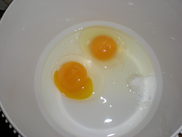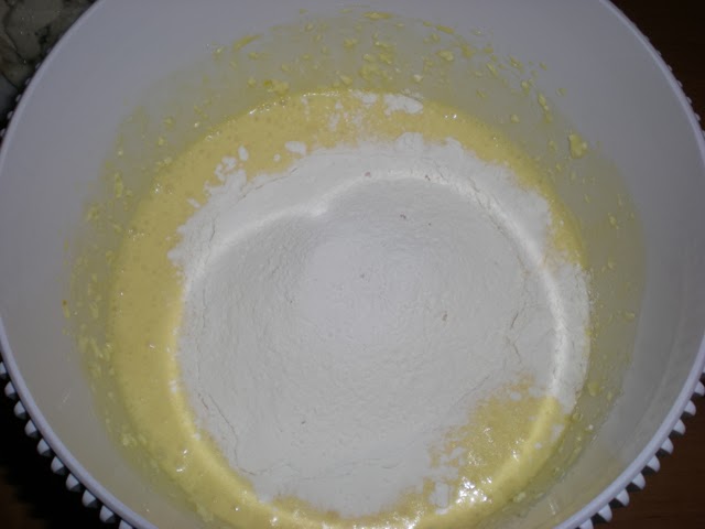 Добавить к яичной массе просеянную муку с разрыхлителем. И перемешать до однородного состояния лопаткой или ложкой.