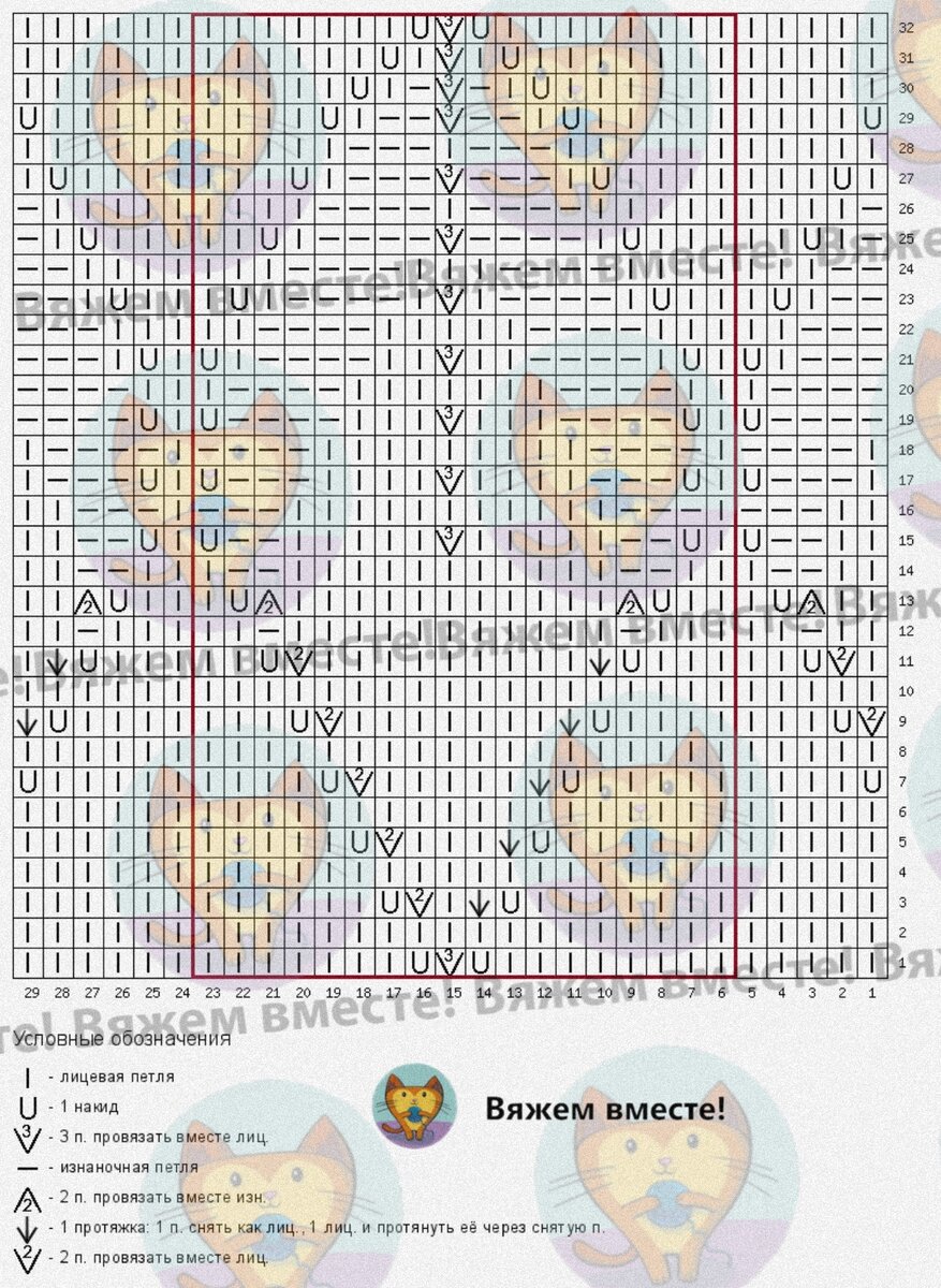 Раппорт ажурных листиков составляет 18 петель по ширине и 32 ряда по высоте.