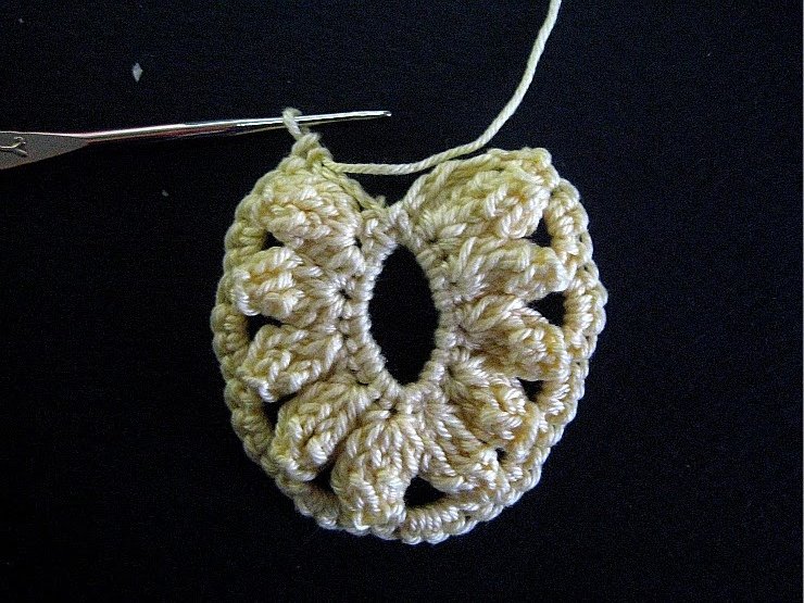 Перевернуть вязание и по верху получившегося мотива провязать арки из 4 возд.п. Затем обвязать их 5-6- ст.б.н.