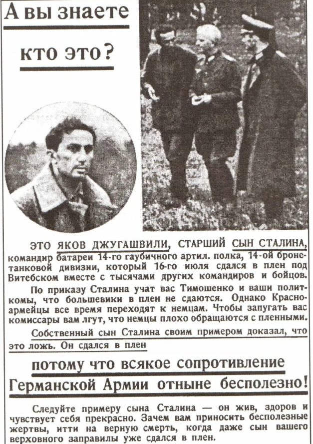 16 июля 1941 года старший лейтенант Яков Джугашвили попал в плен в Витебском котле в ходе ожесточенного боя. Когда немцы узнали, кого они пленили, то были вне себя от счастья. Яков отверг предложение о сотрудничестве с нацистами, но немцы использовали пленного сына Сталина на всю катушку, завалив фронт пачками листовок.