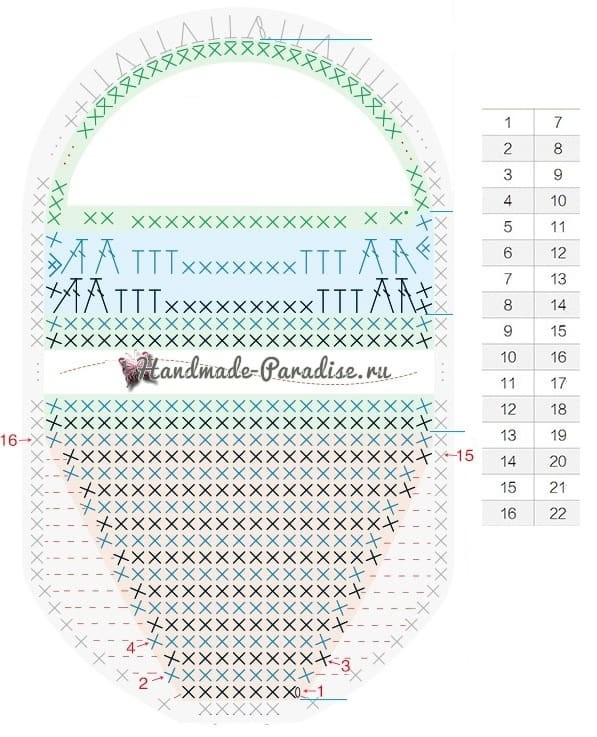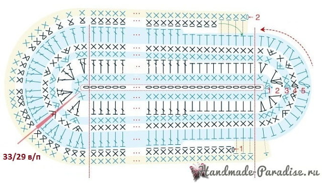 Количество воздушных петель: для размера 27 х 9,5 см = 33 воздушные петли; 24,5 х 9,5 см = 29 воздушных петель.