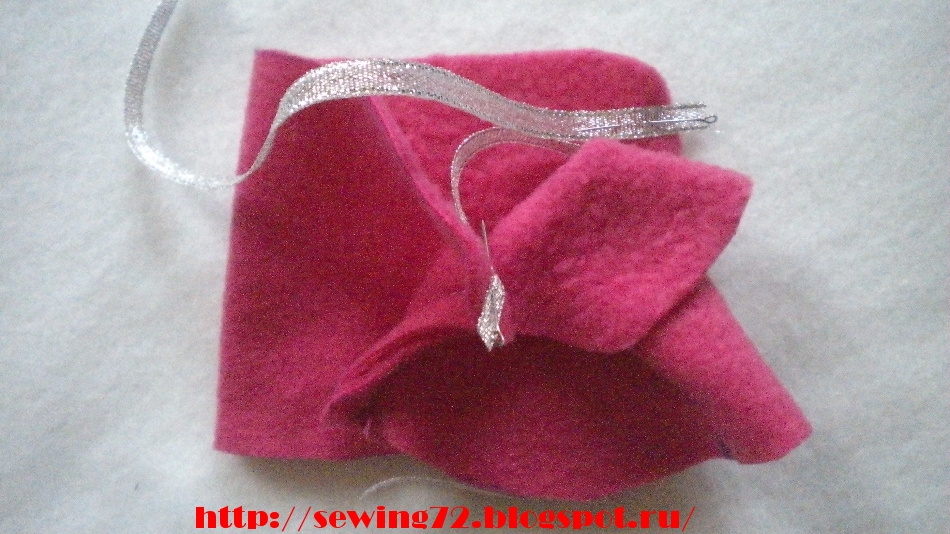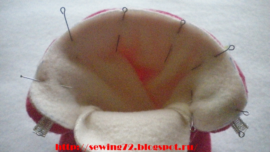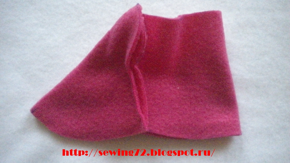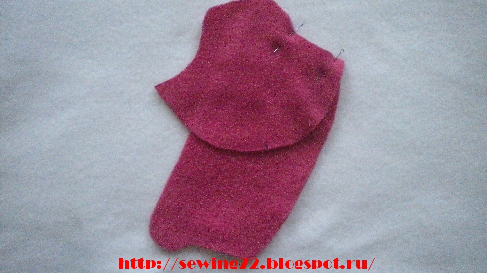 Теперь необходимо обработать верхние края башмачка. Для этого полученные заготовки башмачка складываем лицевой стороной внутрь и скалываем.