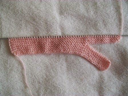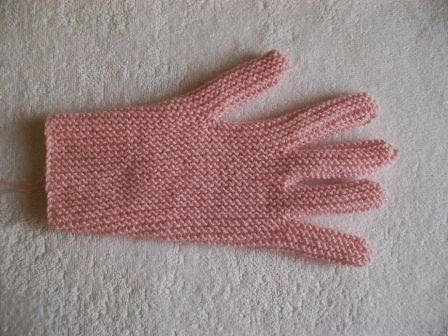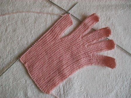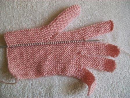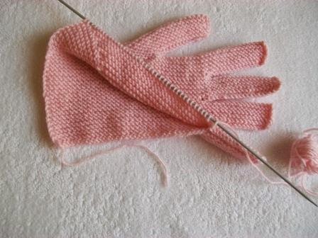 Набираем на спицы обычным набором столько петель, сколько в длину Ваша перчатка от начала манжета до кончика мизинца. И вяжем платочной вязкой полотно на ширину мизинца платочной вязкой.