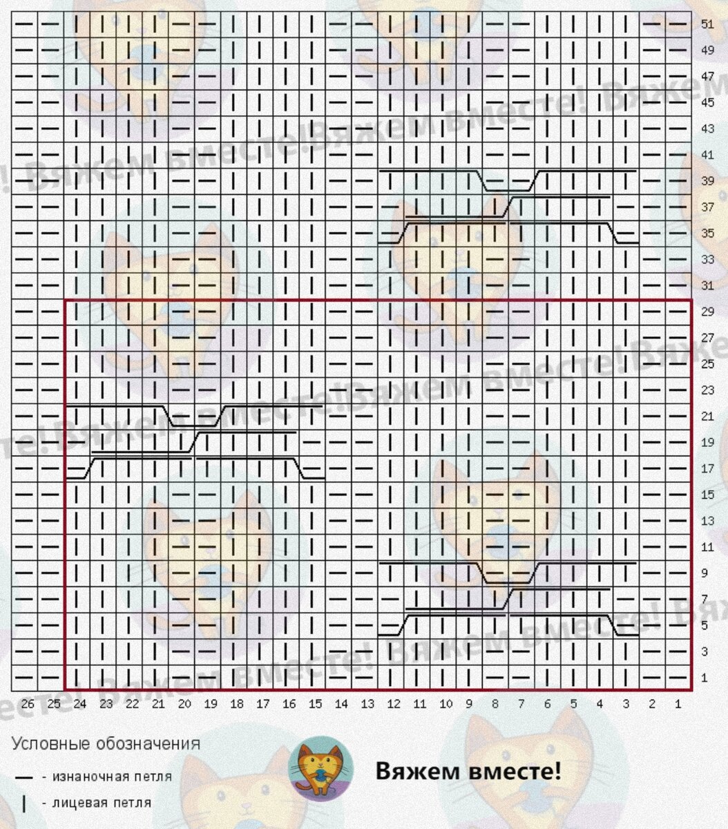 Раппорт узора равен 24 петлям по ширине и 30 рядам по высоте. Петли одного раппорта выделены красной рамкой на схеме.