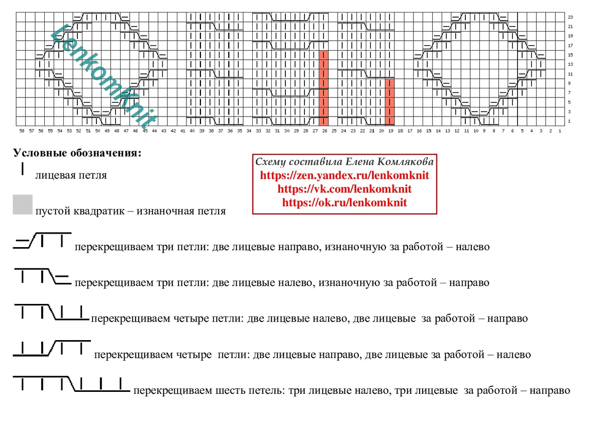 На схеме нарисованы узоры для переда безрукавки. Раппорты жгутов отмечены оранжевым цветом по краю, а ромбы нарисованы по одному раппорту в высоту (24 ряда).