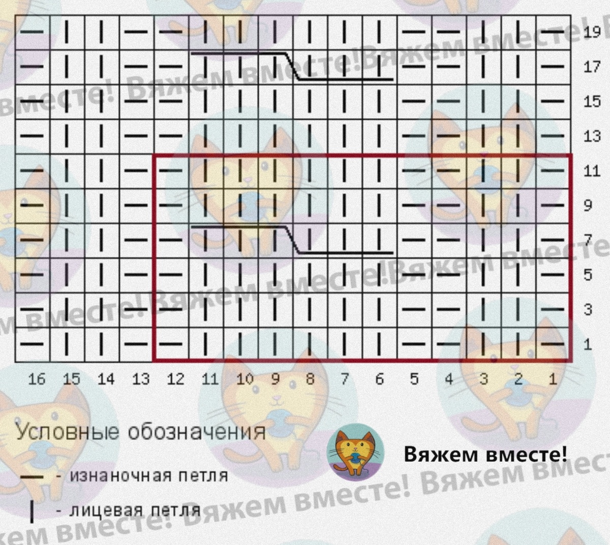 Один раппорт узора равен 12 петлям по ширине и 12 рядам по высоте, выделен красной рамкой на схеме.