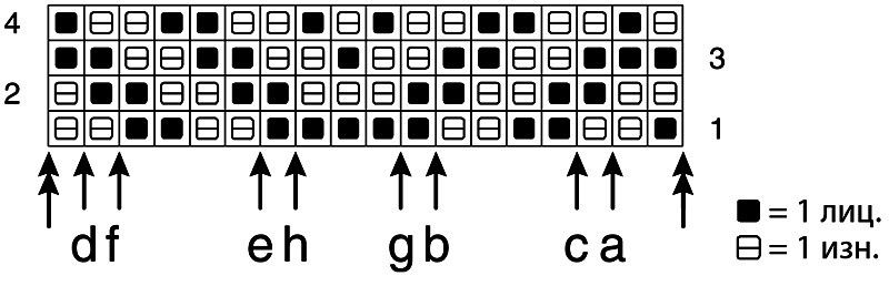 Выполнить временный набор 89 (97-105-113) п. (см. стр. А3), вязать узором в елочку, причем петли распределить следующим образом: кром., начать с 16 (11-15-1) п. между стрелкой а (стрелкой b — стрелкой с — стрелкой d) и левой двойной стрелкой, 3 (4-4-6) раз повторить раппорт из 18 п. между двойными стрелками, закончить 17 (12-16-2) п. между правой двойной стрелкой и стрелкой d (стрелкой е — стрелкой f — стрелкой а), кром.
