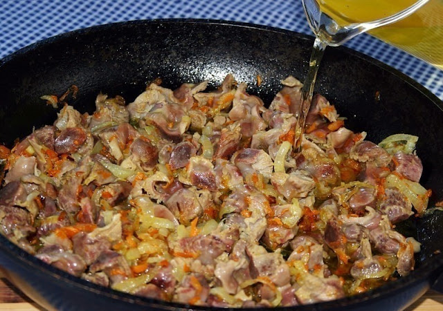 Затем добавьте один стакан куриного бульона или воды и тушите желудочки под крышкой на среднем огне в течение получаса.