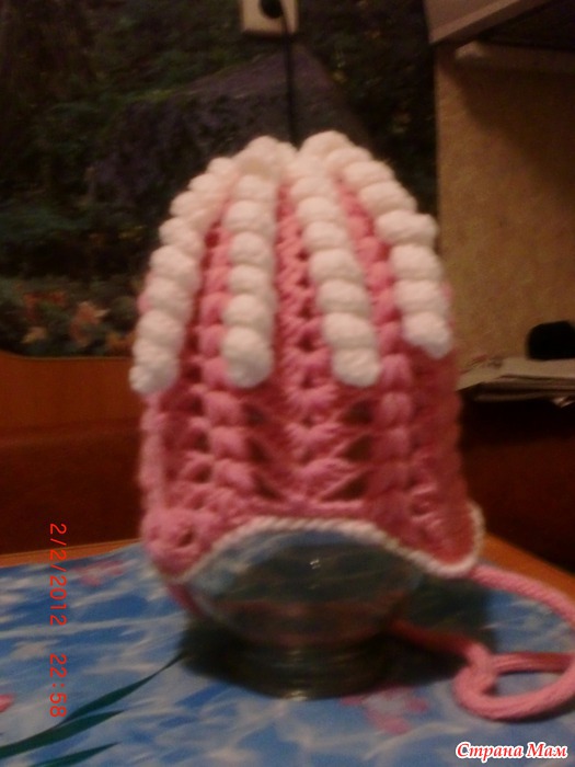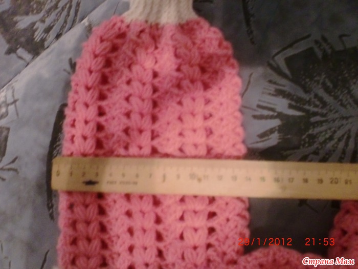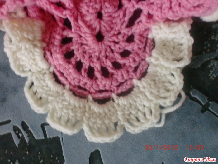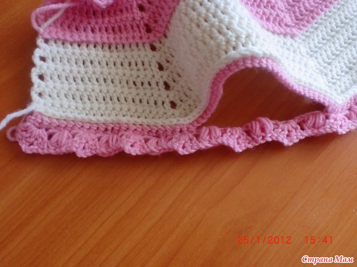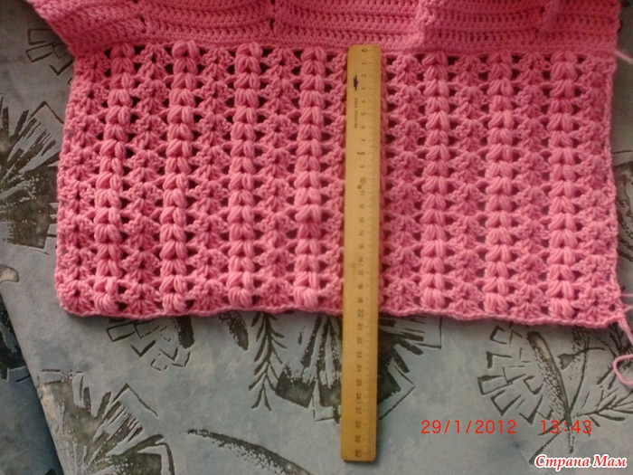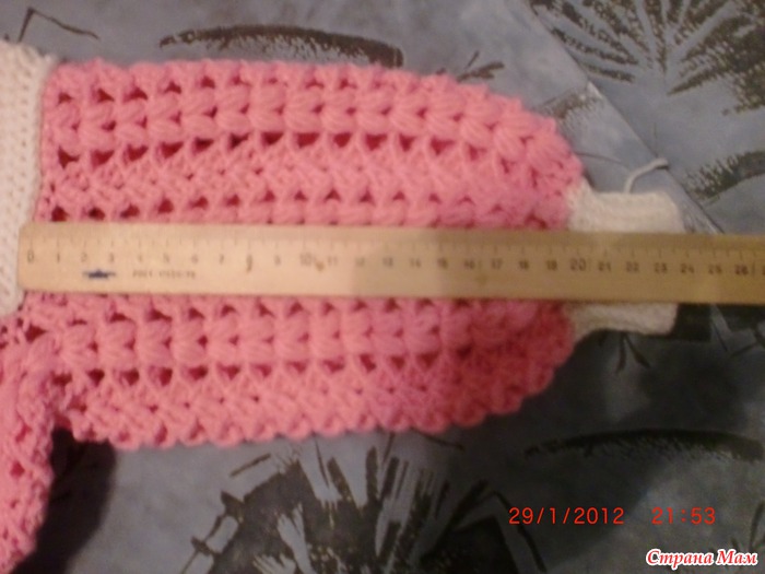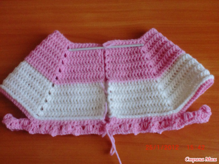 ряд9 что получилось в сантиметрах:высота кокетки15. ширина спинки26. ширина полочки11. пройма12. рукав по линии оката22. длинна от кокетки до низа36(без белой рюши) калпак:горловину обвязала столбиком без накида. набрала рисунок в каждую4 петлю получилось 9 веерков 8 пышных столбиков