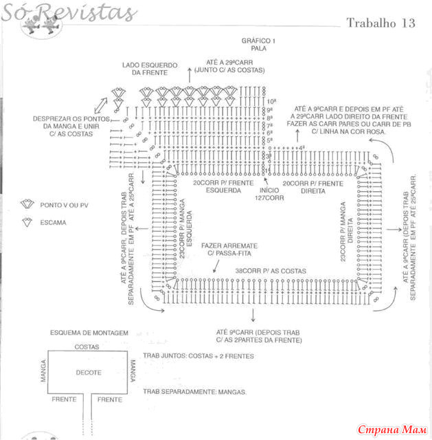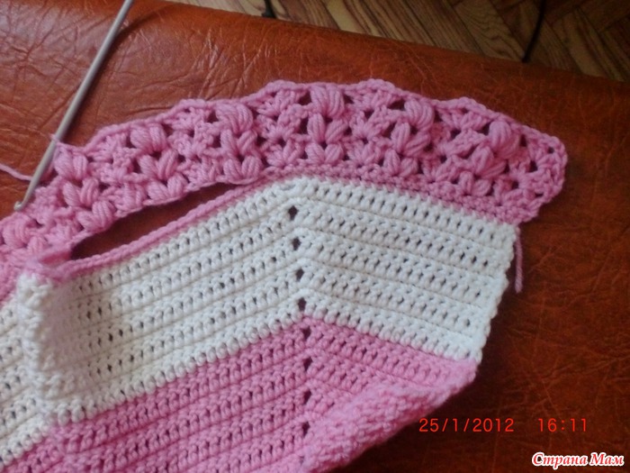 провязатьпо схеме 5 лицевых рядов(всего12) поменять нить на белую. первый ряд белой нитью получается лицевым. его провязать за заднюю стенку. чтобы на правой стороне осталась дорожка из петель для привязывания оборки. провязать5 лицевых рядов болого цветавсего получилось 9 рядов белого цвета. меняем нить. ряд изнаночный вяжется запереднюю стенку. по полочки вяжем 22 ст без накида набираем 16 петель на пройму по спинки у меня получилось43 петли