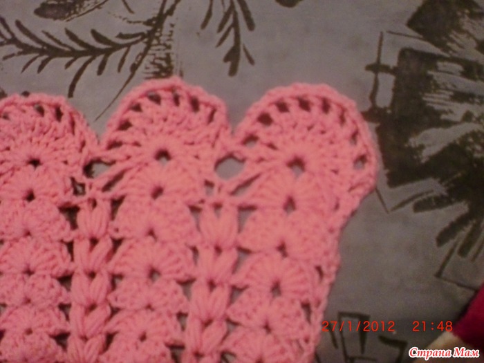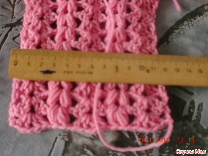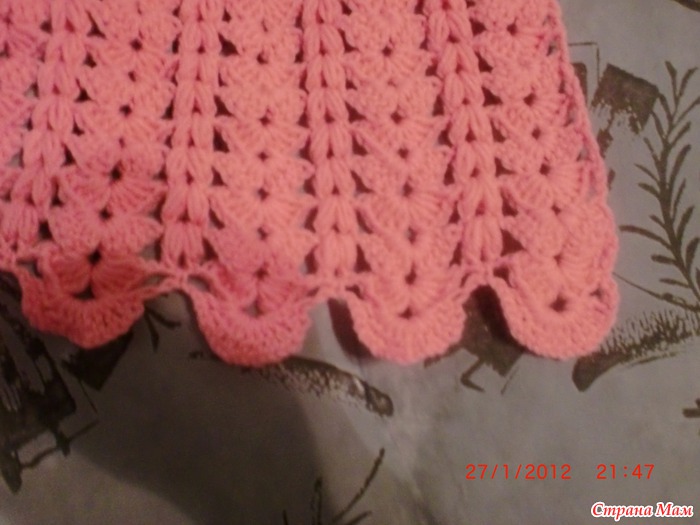 рука по какетки набрала рисунок в каждую4 петлю. по пройме по рисунку получилось 14 веерков 14пышных столбиков. связала 15 рядов. провязала ряд столбиков без накида по 2 вместе. набрала на спицы34 петли и связала резинку.
