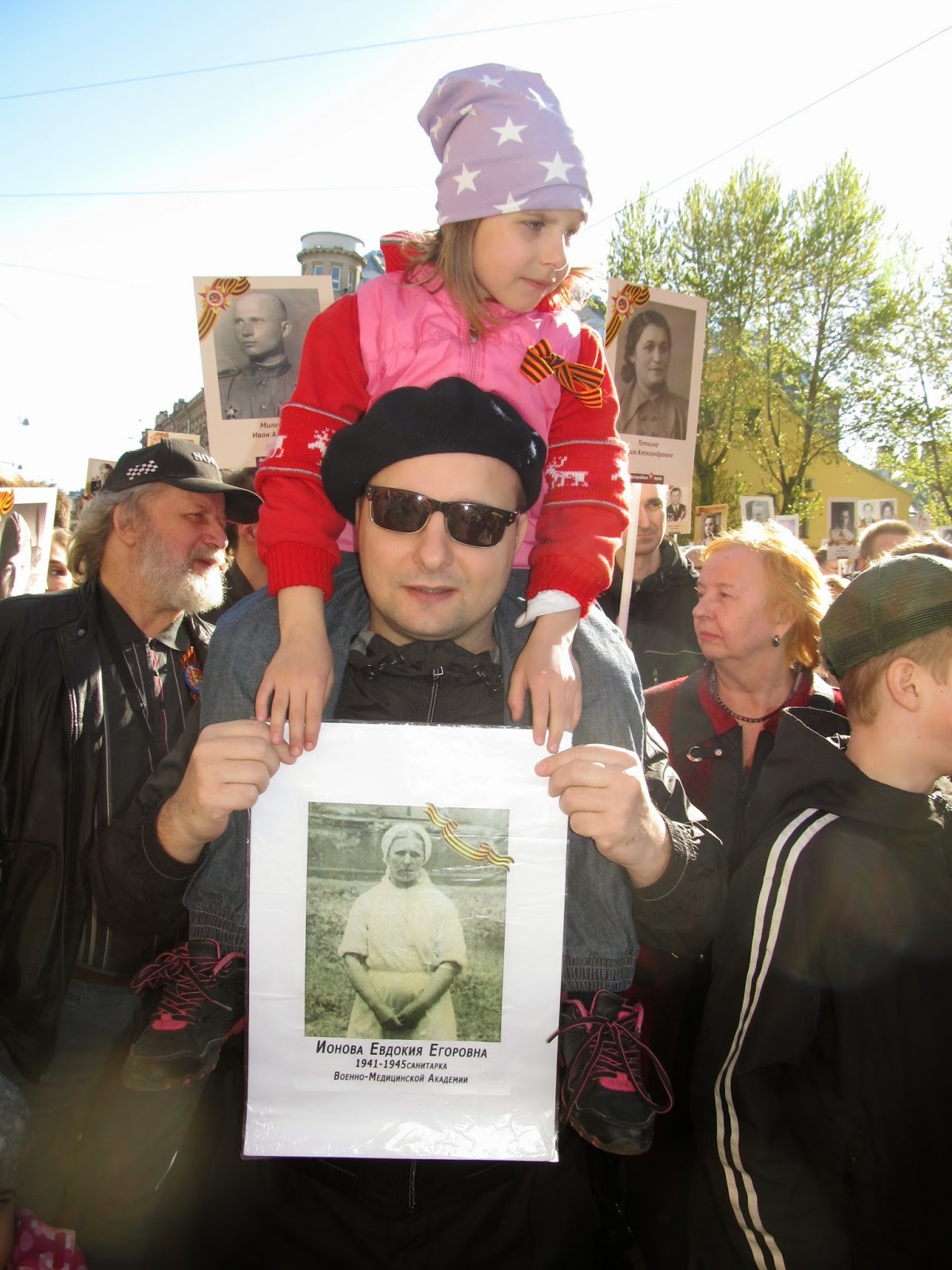 Тысячи горожан всех возрастов с семейными фотографиями солдат пришли 9 мая на построение Бессмертного полка ул. Марата В Санкт-Петербурге