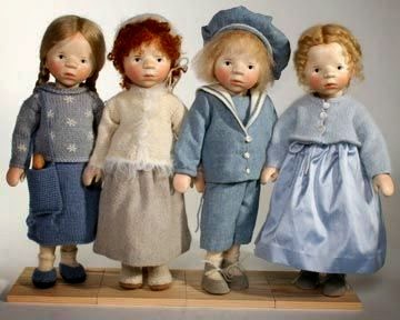 Причем их внешний вид и конструктивные особенности с самого первого появления в 1979 году были настолько совершенны, что с тех пор не претерпели никаких существенных изменений. Все вырезанные из липы или клена детали кукол тщательно шлифуются и присоединяются к телу уникальным пружинным механизмом, разработанным Элизабет и ее мужем Вольфом (у кукол подвижны голова, руки и ноги).