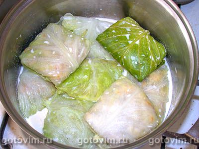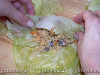 Листья капусты для голубцов можно приготовить двумя способами. Первый: отделить целые листья от кочана, срезать утолщенную часть листа, чтобы лист стал везде одной толщины, опустить на 10 минут в кипящую подсоленную воду. Второй: опустить кочан целиком на 10-15 минут в кипящую подсоленную воду, после аккуратно отделить листы. Подготовленные листья для голубцов обсушить на бумажной салфетке, остудить.