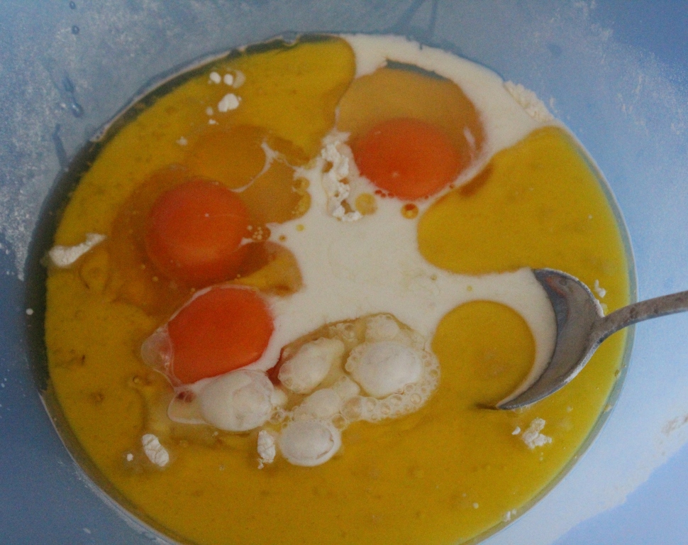 Муку просеять с разрыхлителем, добавить яйца, молоко и масло.