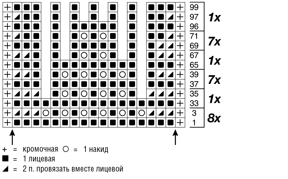 Вязать по приведенной схеме. Между стрелками повторять раппорт из 17 п. Лицевые ряды провязывать, как обозначено на схеме, повторяя указанное количество раз. В изнаночных рядах петли и накиды провязывать изнаночными. Волнистый нижний край формируется за счет узора.