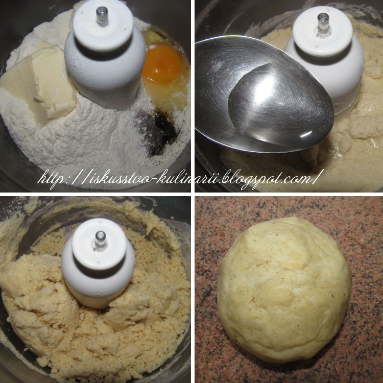 Сначала приготовим тесто. Я это делаю в комбайне. Всыпать в чашу комбайна муку, яйцо, масло, слегка посолить, поперчить и перемешать (насадка "ножи"). Добавить воду, по одной столовой ложке, и вымешивать пока тесто не начнет собираться в ком. Готовое тесто собрать в шар, завернуть в пленку и положить в холодильник пока будет готовиться начинка.