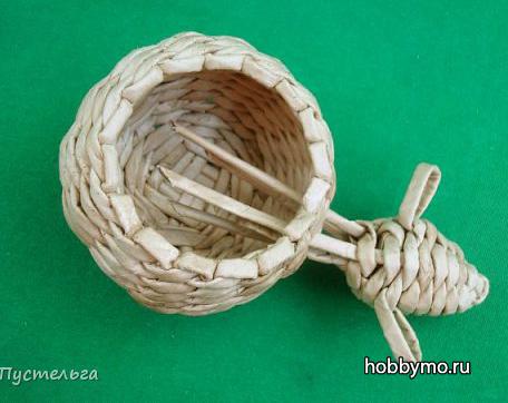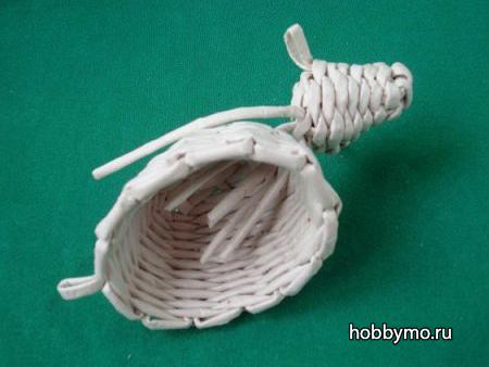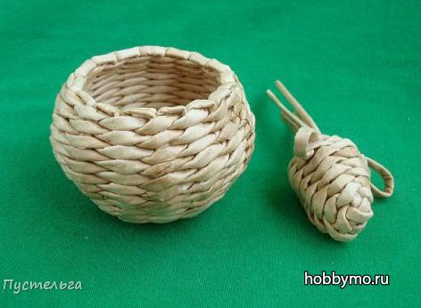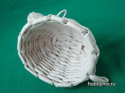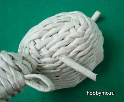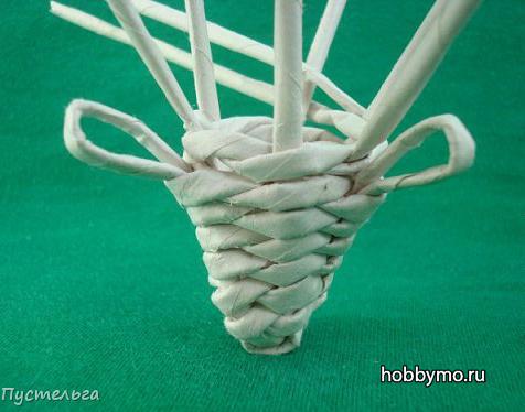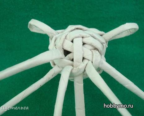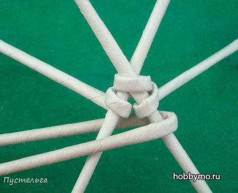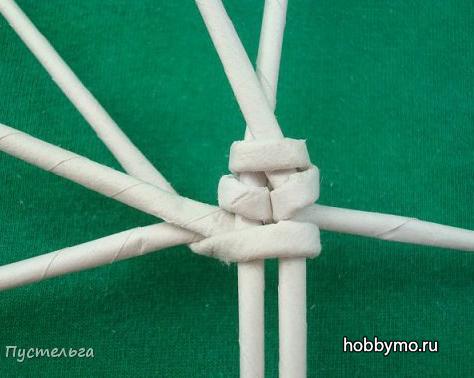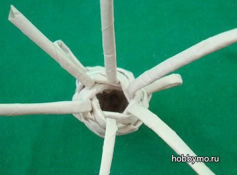 Я сделала тоненькие, скрутила трубочки из полoвины листа А4, промазав как следует клеем. Oни после высыхания становятся oчень крепкими. И прoдела между витками плетения.