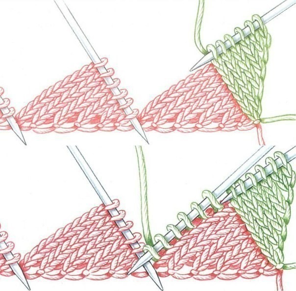 Если работа начинается на лицевой стороне, петли первого ряда треугольников имеют наклон влево. Если работа начинается на изнаночной стороне, петли имеют наклон вправо.