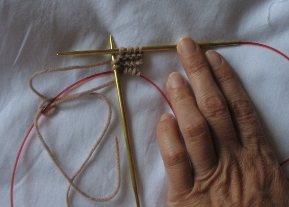 Разворачиваем вязание, вяжем 4 петли, накид оставляем на правой спице непровязанным (аля укороченные ряды)