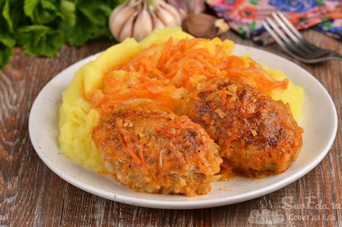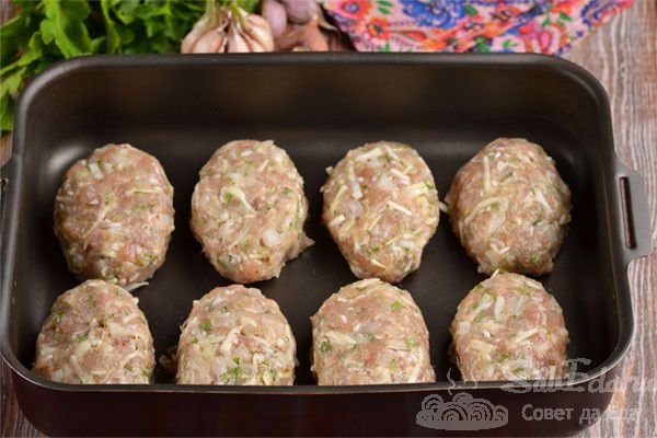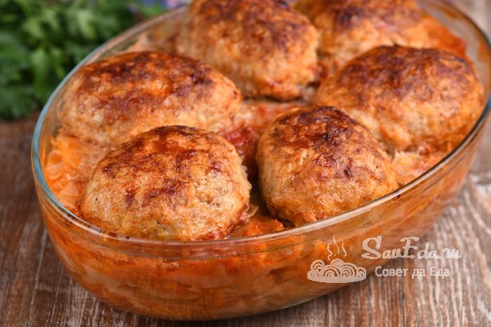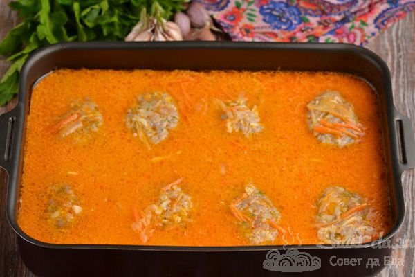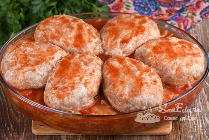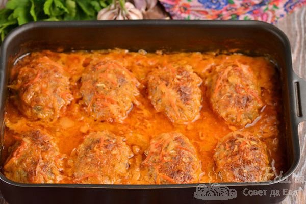 Из фарша формуем 8 котлет и отправляем в форму.Заливаем подготовленным соусом и запекаем в духовке при 200 градусах около 1 часа.