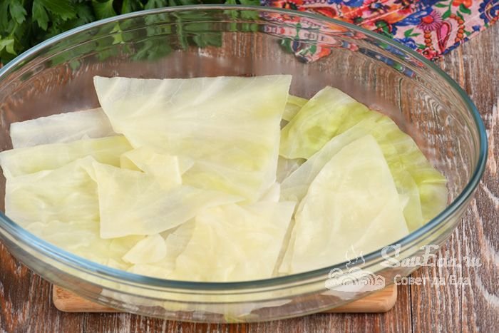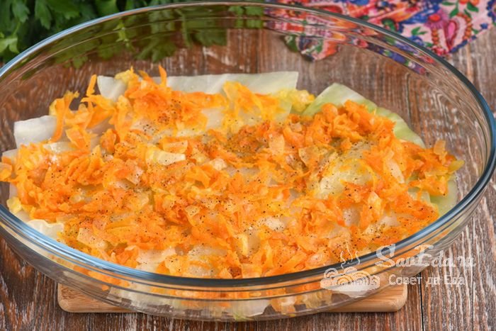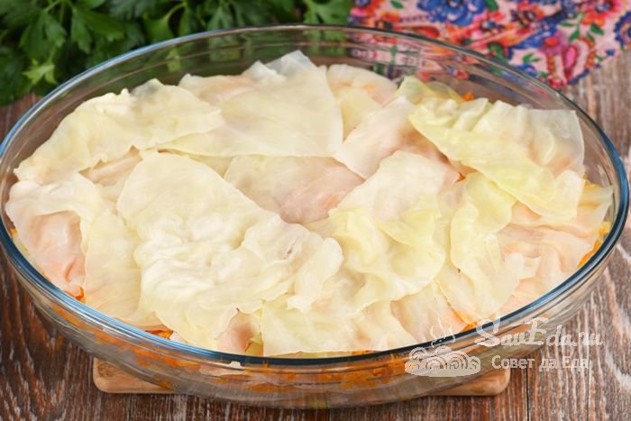Собираем блюдо в большой форме. Листья делим на 4 части, а обжаренные овощи на 3 части. Выкладываем на дно 1 часть капусты.Затем 1 часть обжаренных овощей.