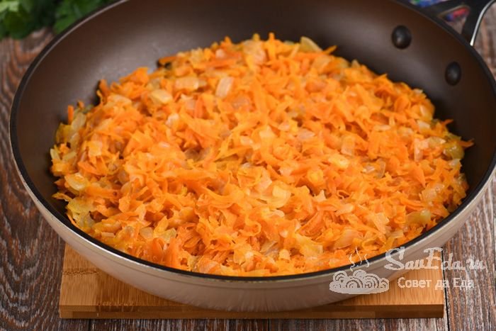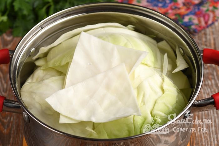 Второй вариант. Он необычный. Капусту (1,3 кг) разрезаем на крупные куски и отделяем листья. Отвариваем листья в воде, пока не станут слегка мягкими.В масле (4 ст. л.) обжариваем мелко нарезанный лук (3 шт.) и крупно натертую морковь (3 шт.). Немного солим.