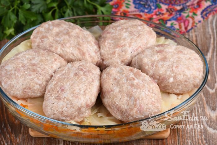 Фарш делим на 6 частей, формуем большие котлеты и размещаем на слоях из овощей.