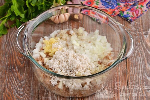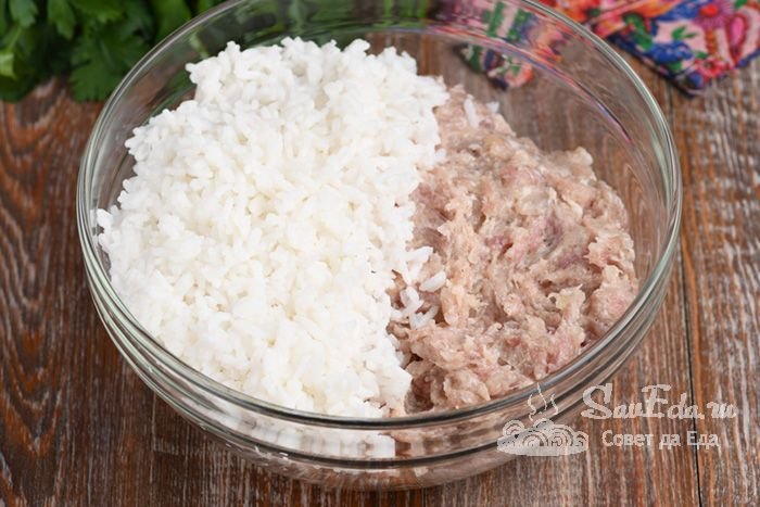Рис (80 г) отвариваем, промываем и даем немного стечь в дуршлаге. Фарш у меня свиной домашний (900 г) в нем уже есть лук, соль и перец. Соединяем рис с фаршем и перемешиваем.