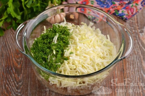 Разбиваем одно яйцо, выкладываем мелко нарезанные укроп, капусту (2 большие горсти) и хорошо перемешиваем.