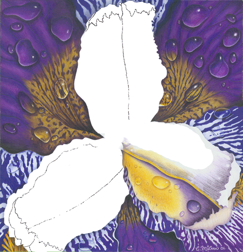 Лепесток ириса имеет зернистый вид Там, где Вы видите, как  маленькие кусочки фиолетового просвечивают через желтый - это  я использовала скотч, который снял пятно желтого, под которым был  фиолетовый.
