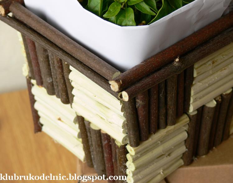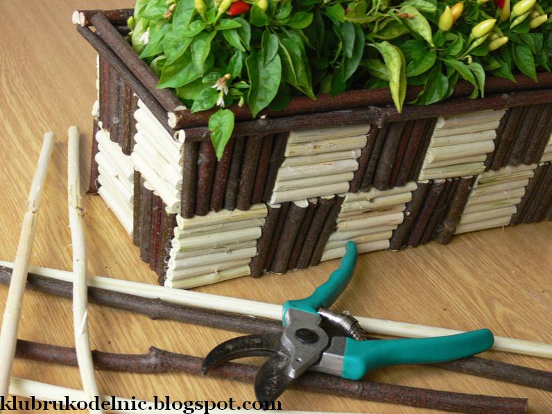 цветочном горшке сделаем из очищенных от коры и неочищенных палочек, сделанных из веточек. Кору следует снимать с еще свежих влажных веток и оставить их на несколько дней высохнуть. Если же взять сухие ветки ивы, то нужно их намочить в горячей воде на несколько часов, потом ножом снять кору и с лыком.