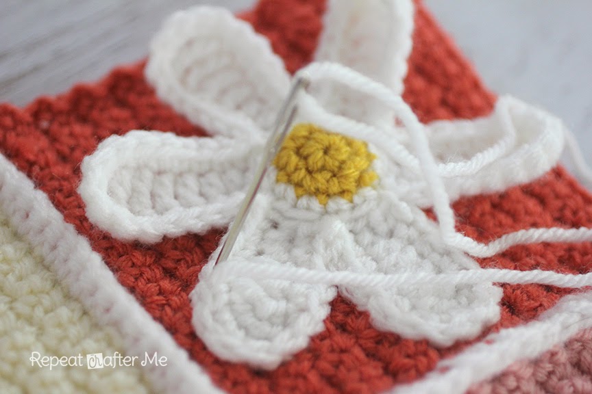 Теперь мы готовы пришить цветы ромашки. Или любые другие вязаные аппликации.