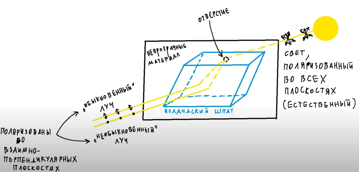Суть эксперимента заключается в наблюдении участков неба через исландский шпат, прикрытый листом непрозрачного материала с отверстием. Видимый свет, идущий от солнца, поляризован во всех возможных плоскостях. Благодаря свойству двойного лучепреломления, при прохождении естественного света внутри кристалла пучок раздваивается и из минерала уже выходят два параллельных луча, поляризованных во взаимно-перпендикулярных плоскостях. Глаз увидит два отверстия вместо одного. И они будут неравной яркости, одно ярче другого. Поляризованный, необыкновенный луч, не обязательно такой же по яркости, как неполяризованный, обыкновенный. Но, вращая кристалл, можно добиться совпадения яркостей. На языке физиков это называется «точка деполяризации».