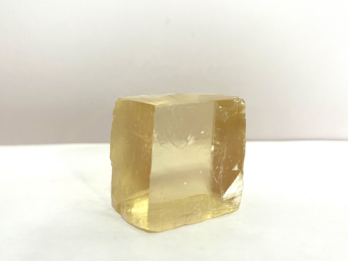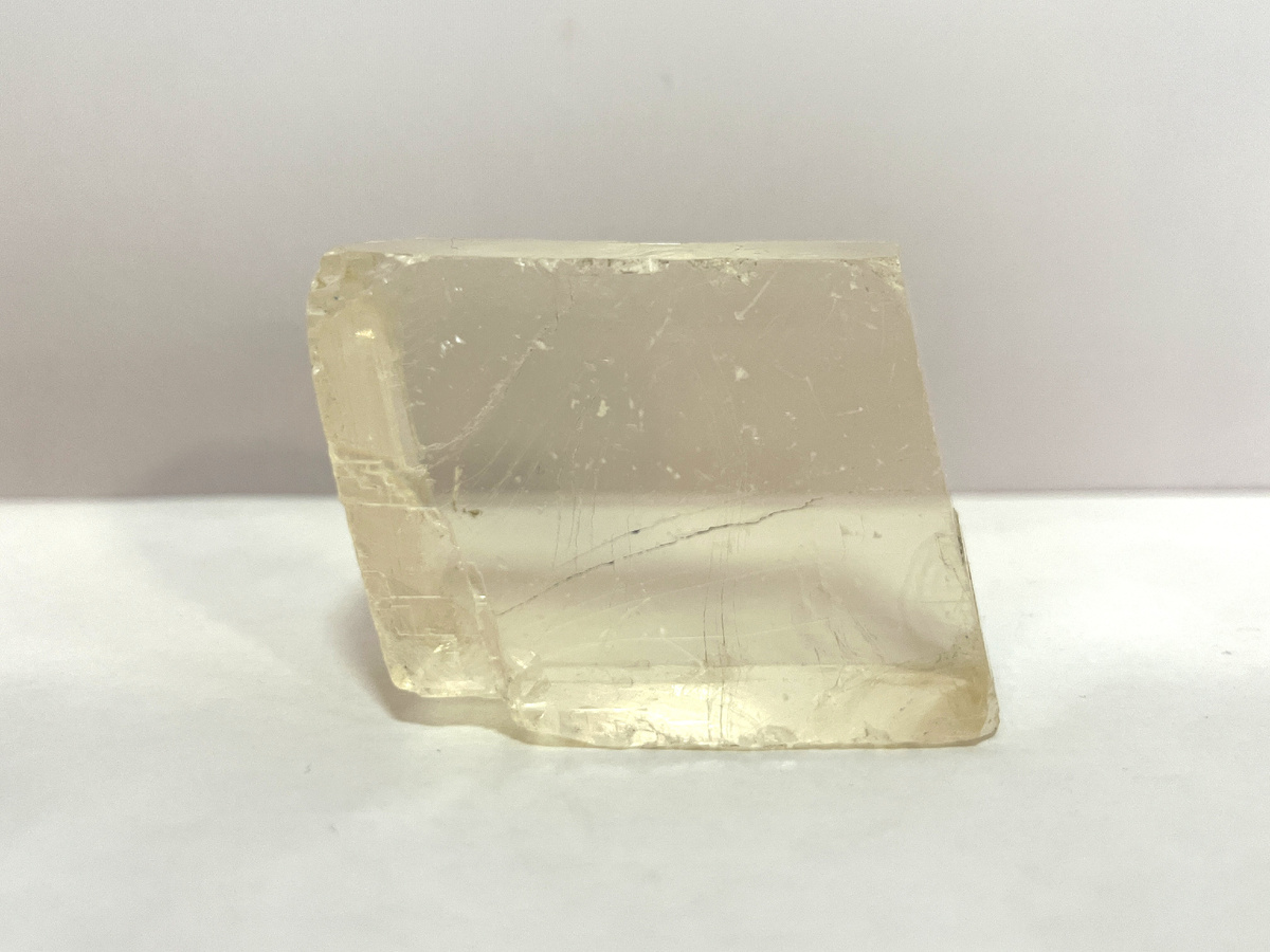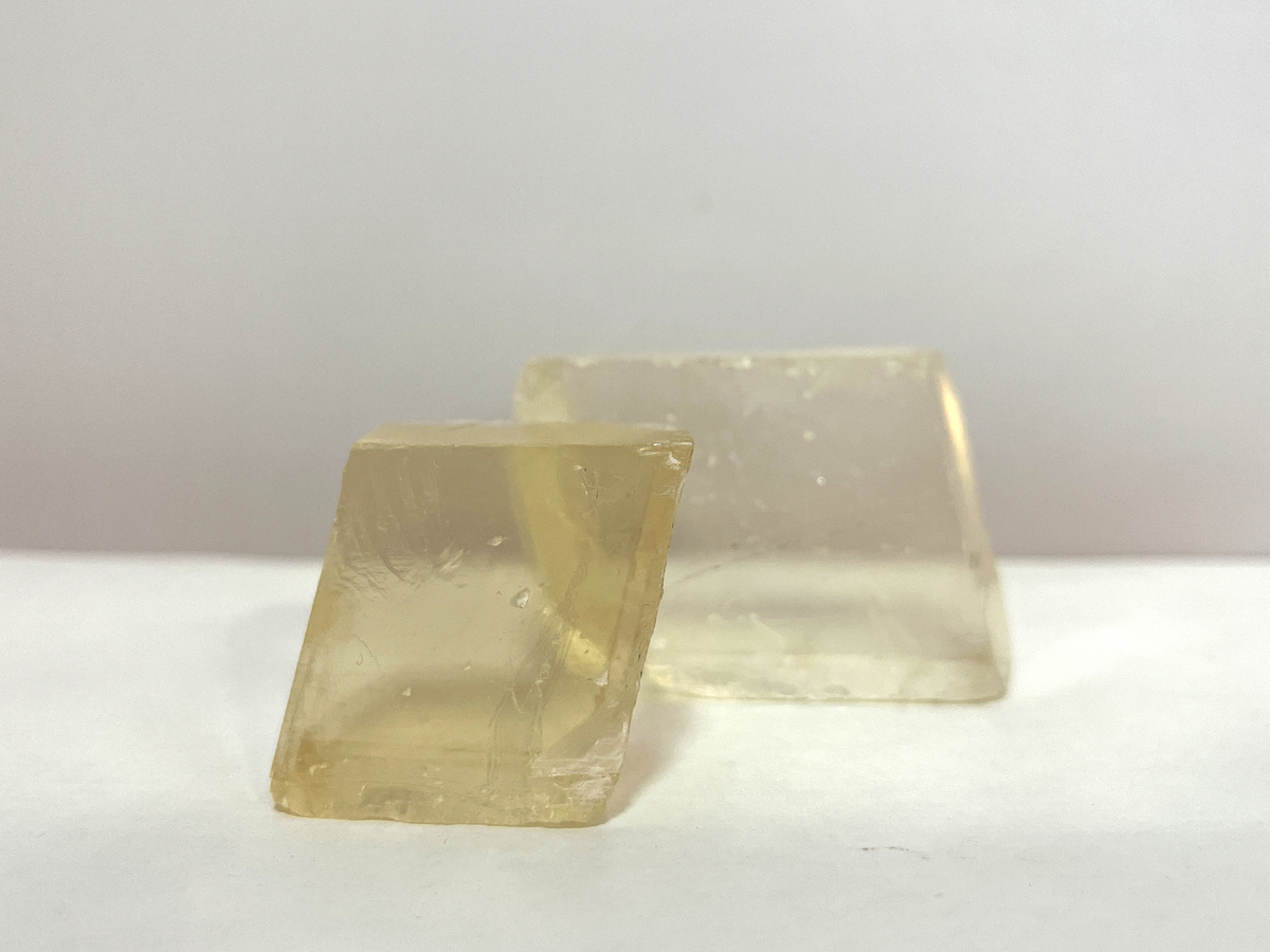 Исландский шпат — это прозрачная разновидность кальцита (CaCO₃), обладающая уникальным оптическим свойством — двойным лучепреломлением. Когда свет проходит через этот кристалл, он расщепляется на два луча, создавая эффект раздвоения изображения.