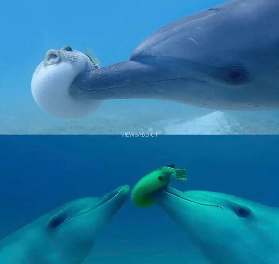 Ну и в качестве вишенки на торте: дельфинов подозревают в употреблении психоделических веществ. В 2013 году мир облетела новость о том, что афалины получают кайф от рыбы фугу. На видео стайка дельфинов играла с ней, словно с мячиком, неустанно при этом ту пожевывая. Испуганная рыба выделяла тетродотоксин — вещество, способное отравить взрослого человека — и после этого дельфины начинали вести себя «странно»: застывали в трансе, таращась на поверхность воды над ними.
