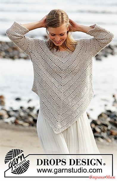 Связанный крючком джемпер-пончо с регланом в цвете DROPS Sky. Изделие связано крючком сверху вниз под углом, А-образной формы и кружевным узором. Размер XS – XXL.