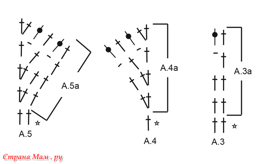 Провяжите два последних столбика без накида в предыдущем повторении по схеме A.5a, провяжите оставшиеся петли по схеме A.3a.
