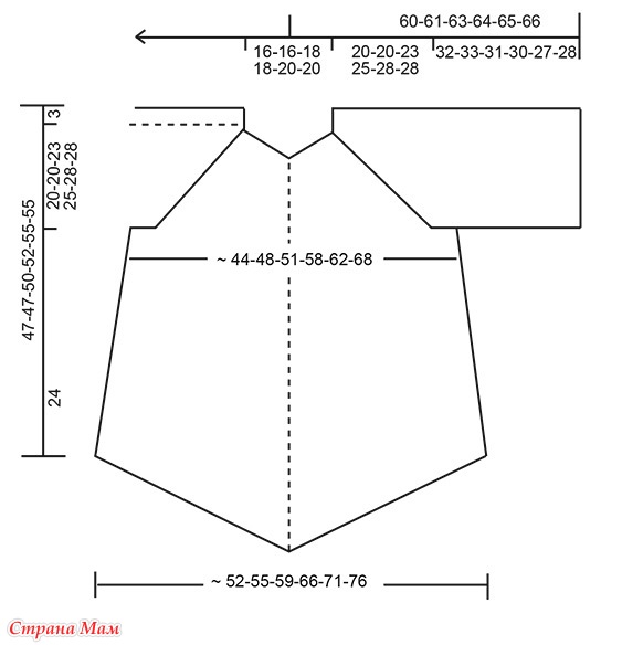 Т.е. увеличивайте в сумме 8 петель на каждом рукаве и 12 петель на передке / спинке для каждого повторения узора по вертикали (= всего увеличилось 40 петель).