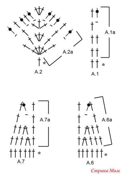 Каждый раз, когда она повторяется, с каждой стороны средней петли делается еще по 6 тройных столбиков, которые выполняются по схеме A.1a / A.3a.