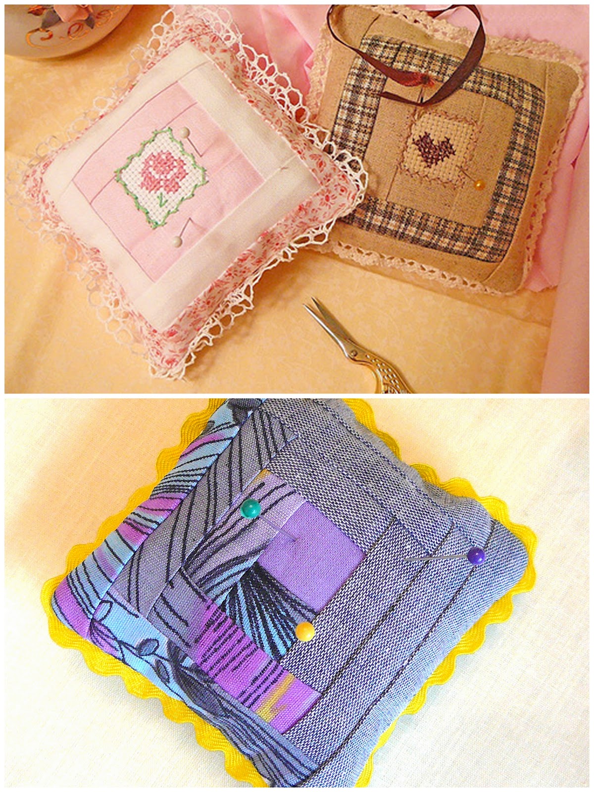 Чтобы блокам не валятся бесхозными, сшила из них игольницы. По краю пришила с лицевой стороны кант, припосаживая его на углах. Далее смотрите здесь.