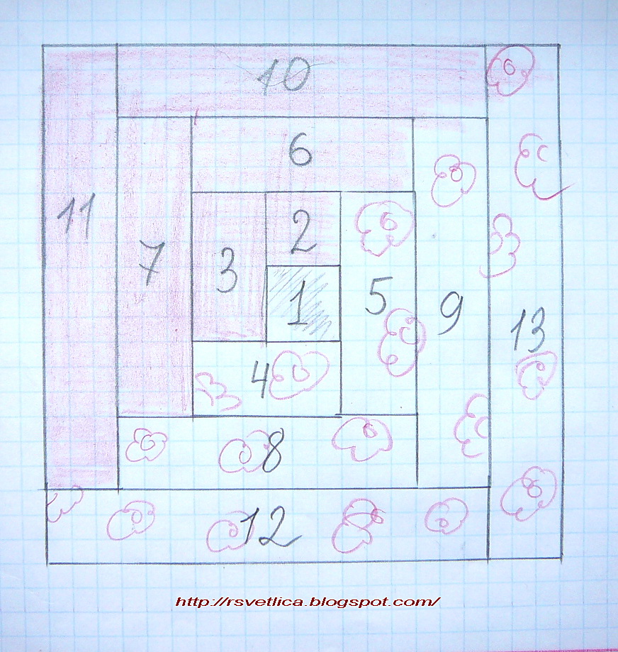 Это схема по которой мы собирали блок. Цифры обозначают последовательность пришивания полосок