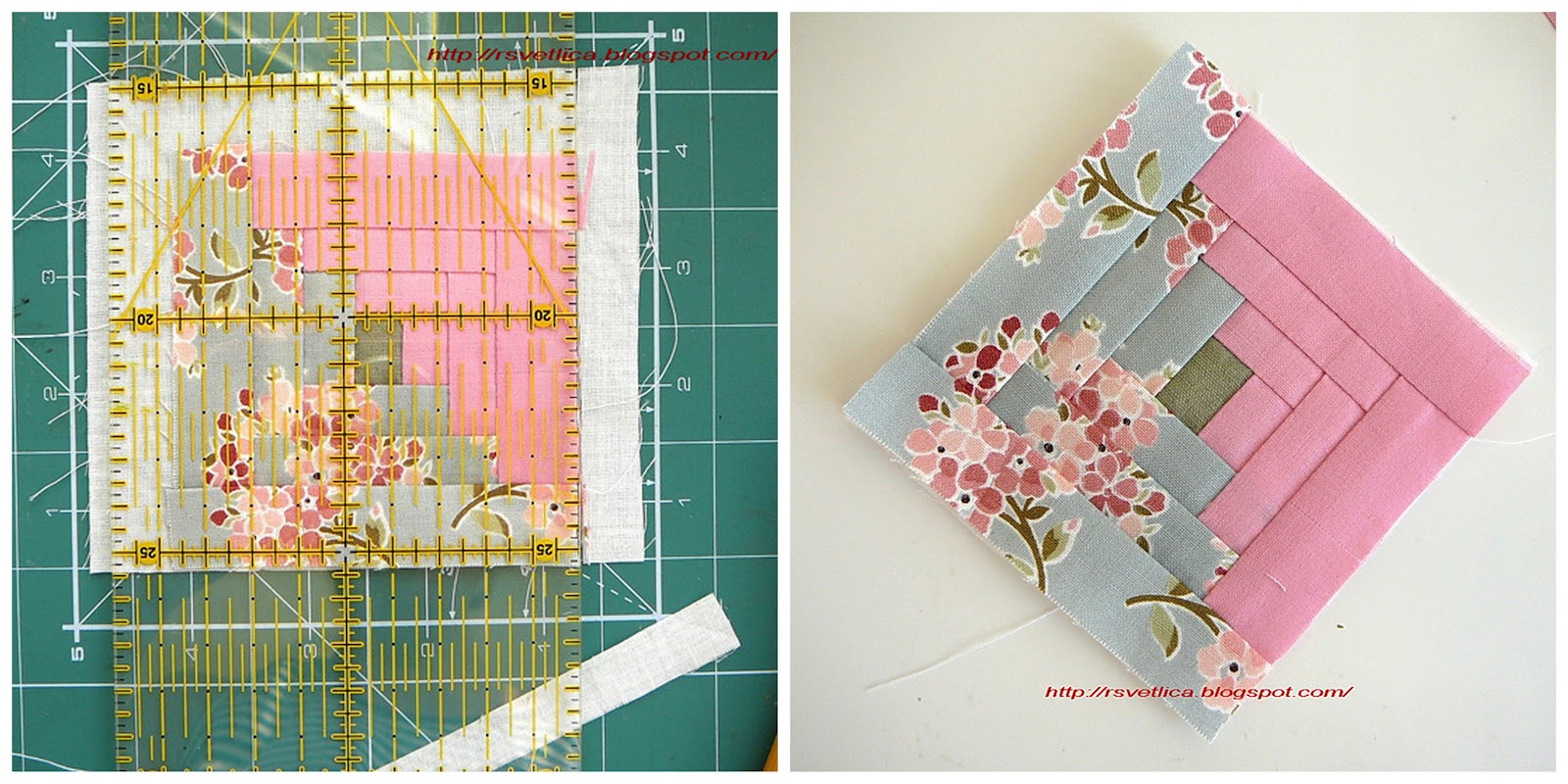 Перед тем как шить подушку сердце, сначала попробуйте для практики собрать простой блок. В лоскутном шитье это один из самых популярных блоков. И наверное самый легкий. Именно с него я начинала первые шаги в лоскутах. У него несколько названий: бревенчатая или русская изба, колодец, очаг, но суть одна- вокруг центрального квадратика (очага) собрать полоски, чаще, по спирали. Классический блок состоит из двух сторон: одна светлая, другая темная. Вариаций "избы" очень много.